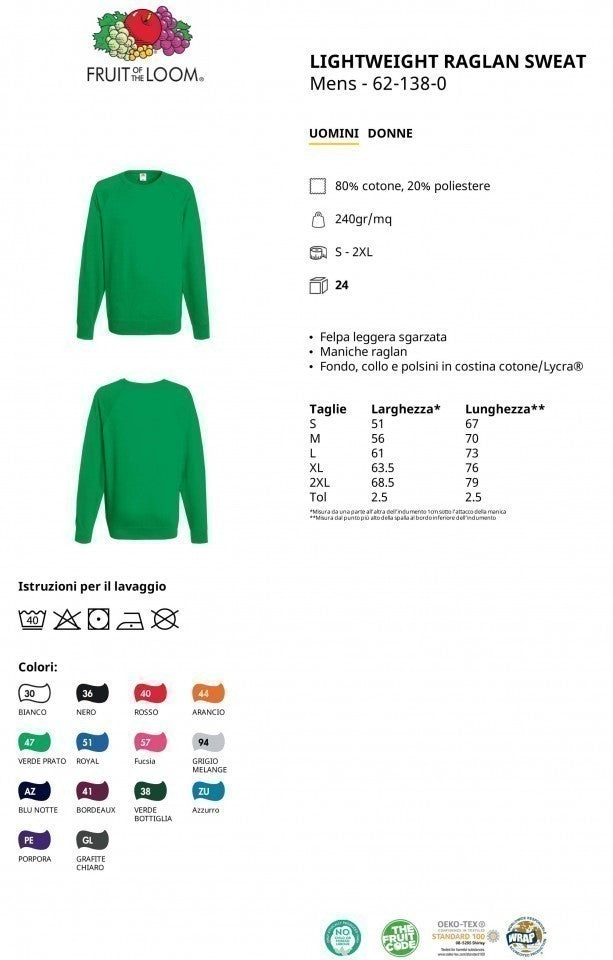 SPEDIZIONE GRATIS EDIZIONE LIMITATA Direttamente dal produttore al consumatore Felpa uomo/donna raglan leggera Numero articolo 227.01 Codice fornitore: 62-138-0 Descrizione: 240 g/m² 80% cotone, 20% poliestere felpa sgarzata maniche raglan collo,orlo inferiore e polsini a costine in cotone/elastan ETICHETTA FRUIT OF THE LOOM FORMATO STAMPA 30 PER 40 CM DIGITALE DIRETTA I nostri sono prodotti artigianali , eventuali piccoli difetti rendono il prodotto unico e personale. La rappresentazione grafica proposta sul Sito potrebbe essere difforme dal prodotto finale (SOLO per eventuali variazioni di colore). Le gradazioni di colore delle immagini e dei soggetti grafici di alcuni prodotti – in funzione della tecnica di stampa utilizzata – potrebbero variare rispetto all’articolo presente sul nostro eShop. ISTRUZIONI AL LAVAGGIO 20- 30 GRADI ACQUA FREDDA Con acquisto di due o più prodotti riceverai un simpatico OMAGGIO Abbiamo a cuore l' Eco-sostenibilità dei nostri processi lavorativi, è per questo motivo che preferiamo capi e procedimenti di stampa certificati OEKO standard internazionale che garantisce la totale assenza di sostanze nocive . La stampa digitale diretta su tessuto è la tecnica di personalizzazione che utilizziamo principalmente , fornisce stampe con resa fotografica di alta qualità, ad alta definizione e soffici al tatto, poichè il colore penetra completamente nel tessuto