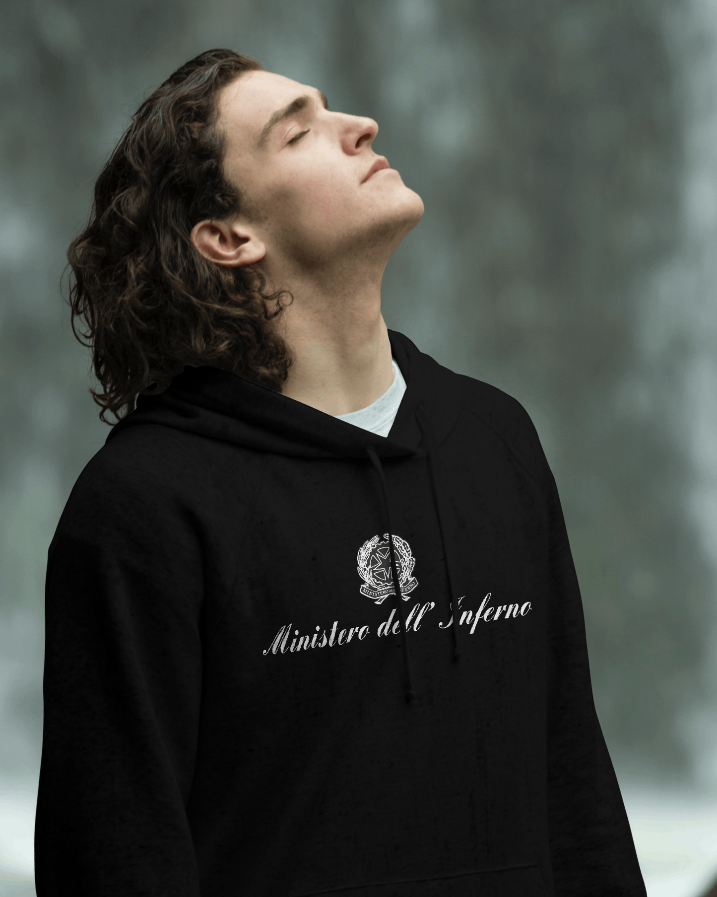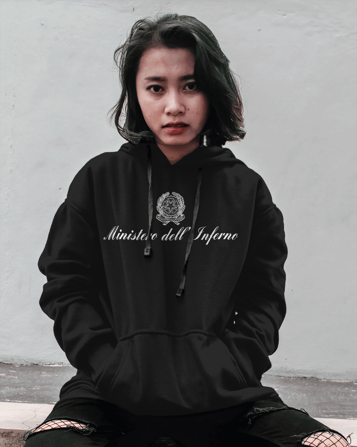 Felpa CON MARSUPIO E CAPPUCCIO DA ADULTO con stampa Ministero dell'Inferno solo davanti