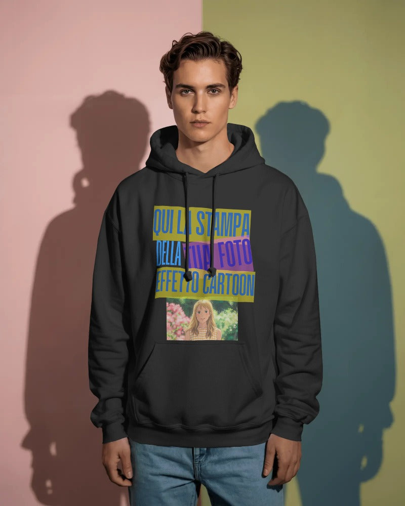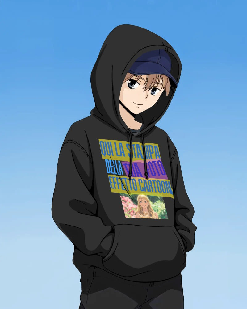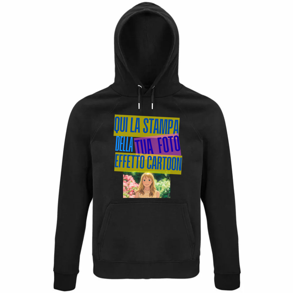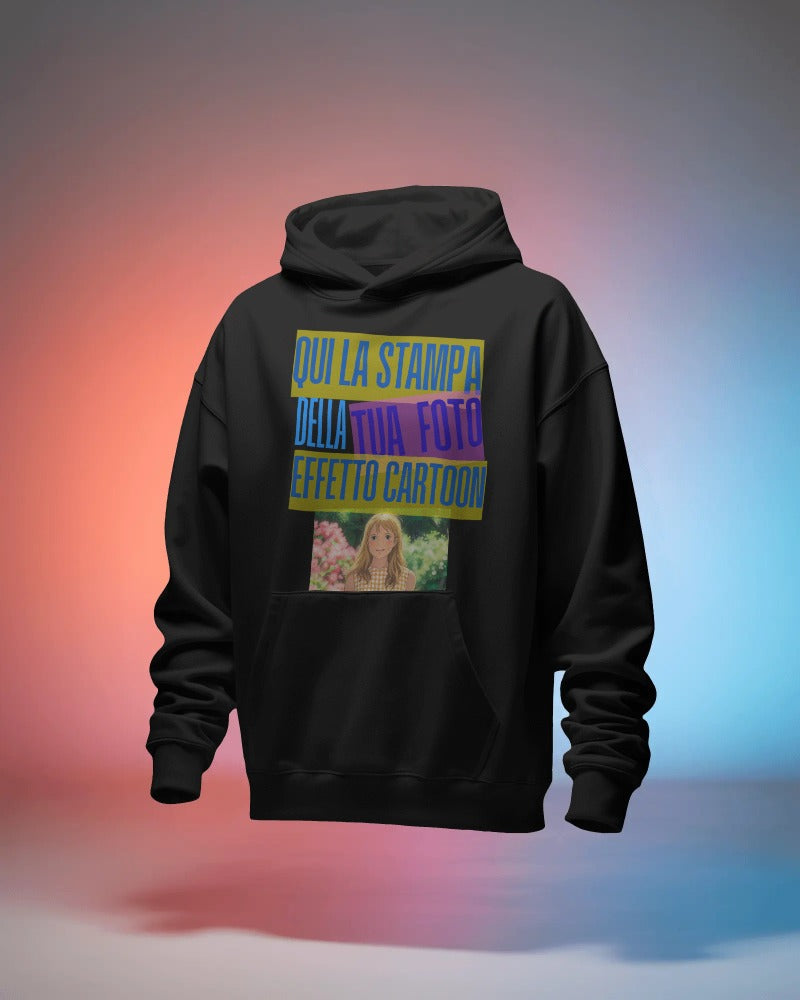 Felpa nera con cappuccio e marsupio personalizzabile effetto CARTOON