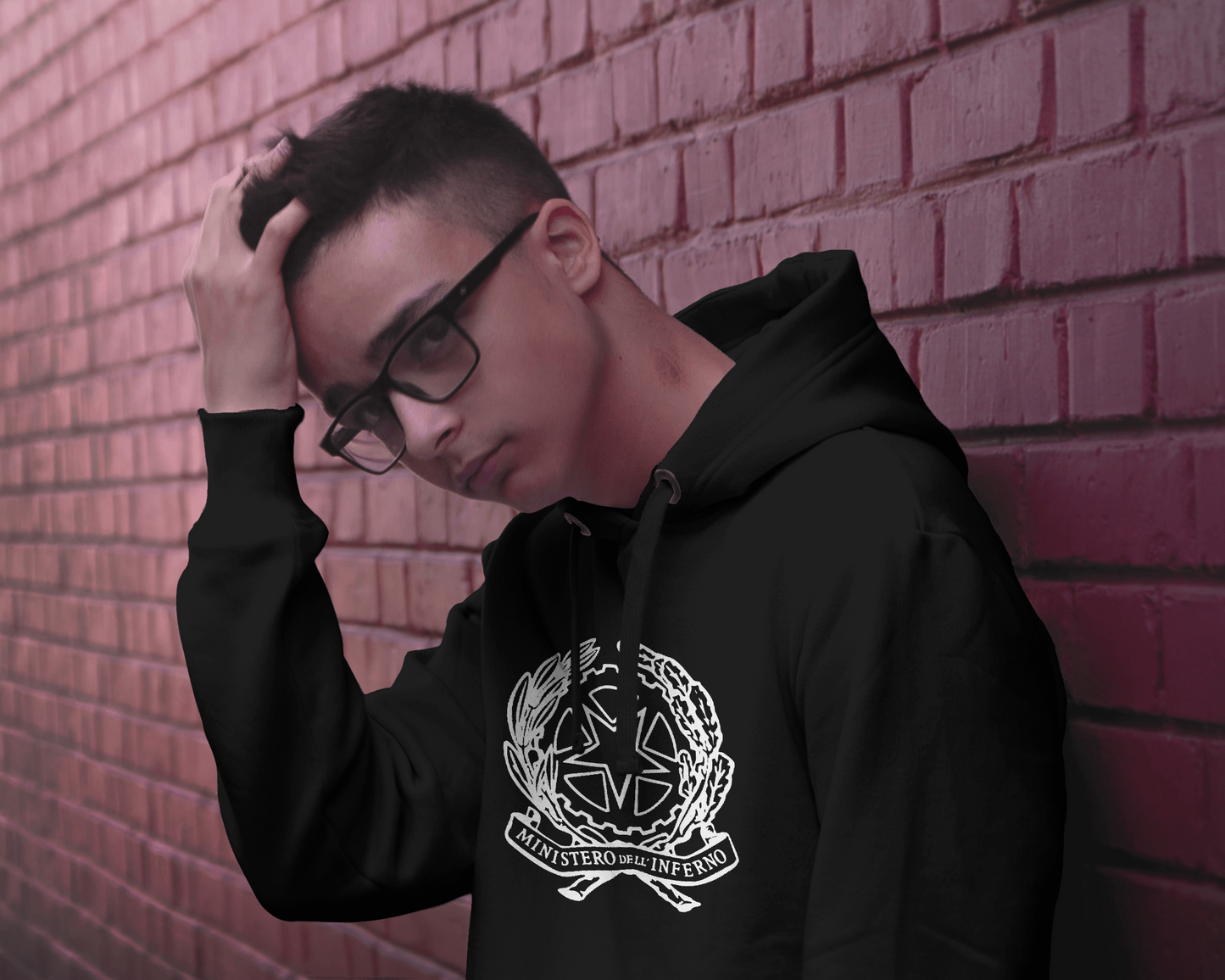 ìFelpa CON MARSUPIO E CAPPUCCIO DA ADULTO con stampa Ministero dell'inferno solo davanti